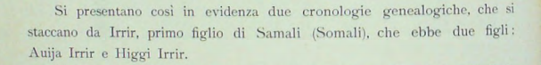 The above is an extract from the 19th century writings of Italian explorer Luigi Robecchi Bricchetti. The above Abtirsi of Hawiye Irir and Aji (Father of Dir) Irir and how they trace their ancestry to Samaale/Somali was recounted to him by a Hawiye elder who lived more than 130 years ago. Try telling that to the ignorant fools who assume it is the creation of some Isaaq politician in the 60's.