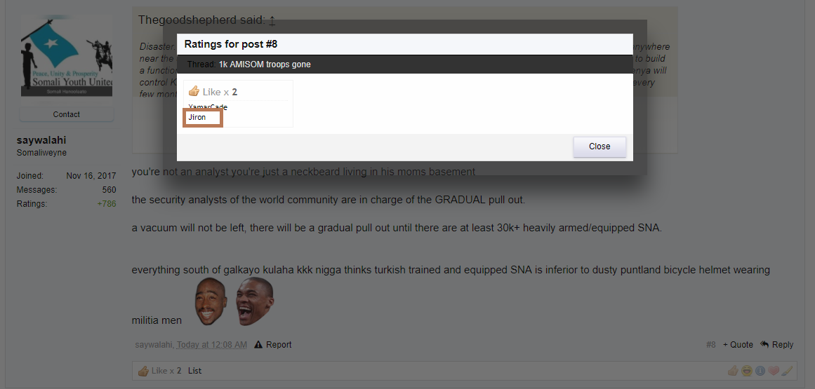 No matter how relatively reasonable and normal they seem to be, they'll always have a case of Majeerteentitis. @Jiron you can hide your cuqdad but you caný hide your likes. Welcome to my target list. ass thought he could enter the politics section without being scrutinised.