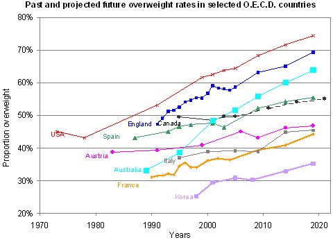 Americans often think of obesity as a uniquely American problem, and it is true that only Mexico has a higher rate of obesity and overweight, but a new report from the Organisation for Economic Cooperation and Development, reported on by the New York Times, reminds us that obesity is a worldwide epidemic that affects all rich nations. Severely obese people die 8-10 years younger than people of healthy weight and every extra 15 kgs of weight (33 pounds) increases the likelihood of early death by 30%. Despite the tremendous costs the rate of overweight and obesity is skyrocketing. By 2020 75% of the United States, 70% of the UK, 65% of Australia and majorities of Spain and Canada will be overweight; 70% of people in Mexico already are. Obesity (being severely overweight) is more medically worrying than overweight, and it too is skyrocketing, reaching 16% among males and 17% among females across the OECD, 30% in Mexico and 28% in the United States. Across countries, the rates of obesity tend to be highest among the poor and uneducated who have less access to healthy foods and know less about healthy choices
