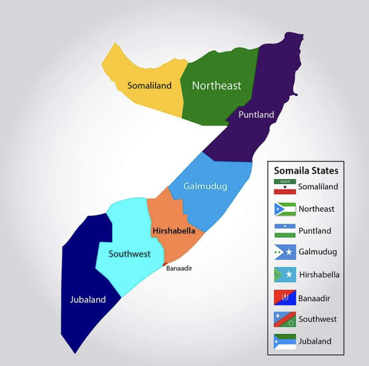 Somalia should be split up into 12 states. Kind of like this, but get rid of banaadir state, cut PL in half, cut NE in half, cut SL in half, and JL and SW should be made into 4 quarters each being a state.