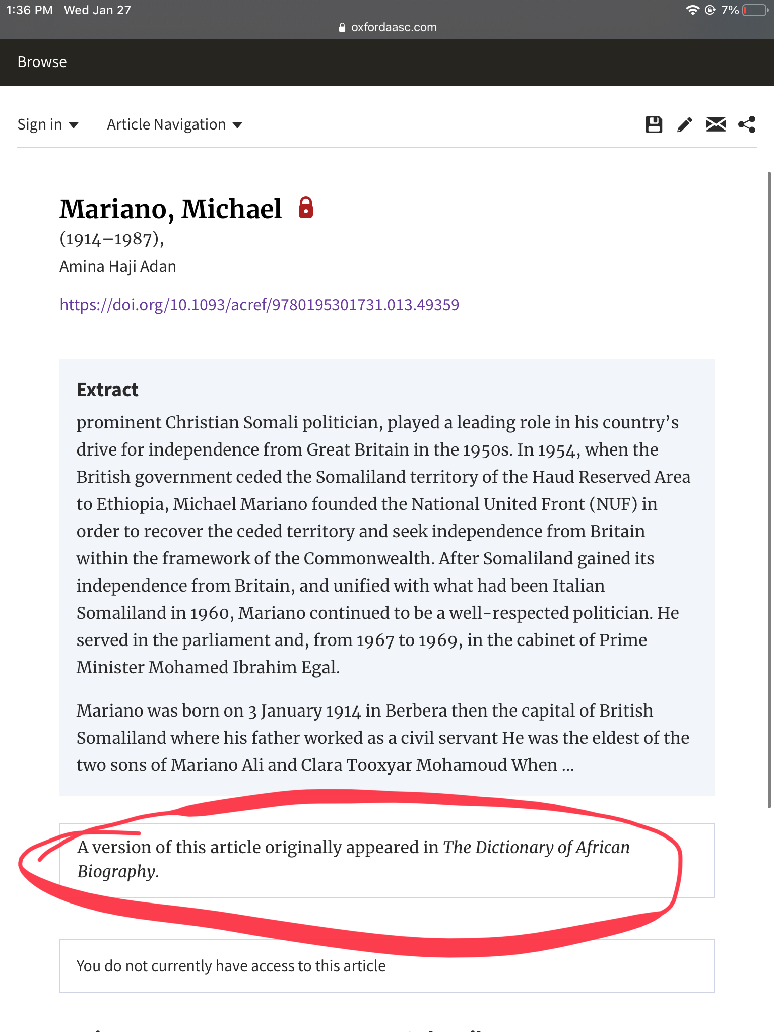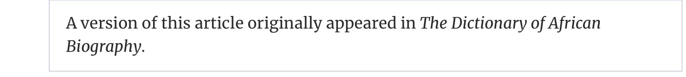 1) I clicked on the link; oxford. It says it also appeared the African biography. I highlighted it for you.