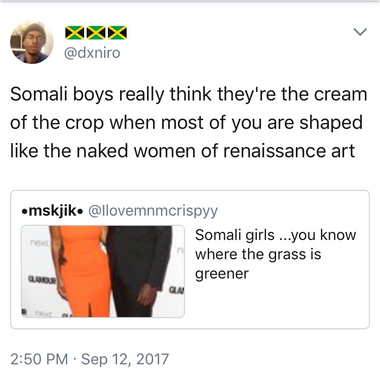 I was about to drag you at firstShe's perpetuating the idea that somalis don't think of themselves as black, but arab. That shit is disgusting. All of these kinds of videos on youtube claim somalis think they're above other africans. It is true that many somalis do not identify with the idea of collectively being in a group with other africans called "black" simply because of sharing similar skin tones. However, that does not mean somalis think they're arab or whatever it is they assume. These people are too obsessed with the concept of race, that if a group like somalis disassociate themselves with the concept, they believe we think we're above them because we look different. THEY THINK WE LOOK DIFFERENT, we never say that. These people are living according to an idea created by whites, to give up their unique individual identity. Somalis do not sign up for that. Forget the "cushitic" bull, somalis identify with being somali & that is hard for a lot of other africans & african americans to understand. And the only reason this has become an "issue" now is because there has never been this many somalis outside of somalia, ever, so we are new to people.