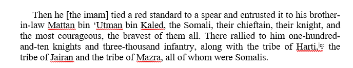 Imam Ahmed wasn't Somali, everytime a Somali is mentioned in the Futuh they add the epithet of "the Somali" or As-Sumaali in Arabic.The Imam,his wife and majority of the muslim principalities of the Horn were ruled by non-Somalis.The Somalis were peripheral people who lived as nomads and would involve themselves in politics in order to get paid or the opportunity to loot for booty.