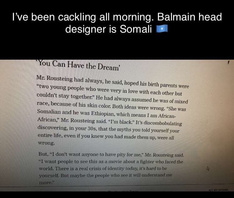 Balmain is a French designer who was adopted and had always thought he was mixed but turns out he is a full African and that his biological mother was a Somali and she gave birth to him when she was a kid his biological dad turns out to be an Ethiopian. Apparently, he is going to make a documentary about it. Also, he is send a letter to his birth mom and is waiting for her to respond, but he said he is scared that she will reject him again.
