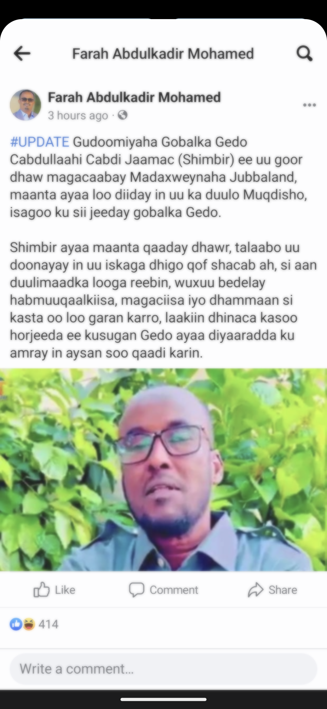 Breaking news: The newly appointed Gedo governor has been denied entry to a flight departing from Mogadishu headed to Garbaharrey. He tried to disguise himself but the flight crew caught him. He has been barred from entering Gedo by Canjeex's parallel administration.