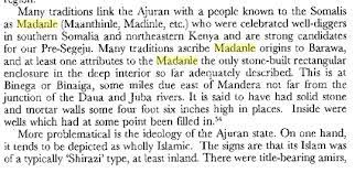 The origins of the Madanle people are unknown. Their ethnic identity is unspecified. The only thing we know is that they were allied with the Ajuran. You mentioned a source that says many traditions ascribe Madanle origins to Barawa. If that's the case, then they are closely related to the Arab inhabitants of Barawa, since they founded and built the city. You basically contradicted yourself. Most of the sources about Mandale are oral fairytales from the nomads.got no time for hoteps