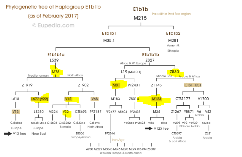 E-M215 originated in Northeast Africa (Horn of Africa) around 26,000–34,000 years ago, and spread through ancient migrations into North Africa.
