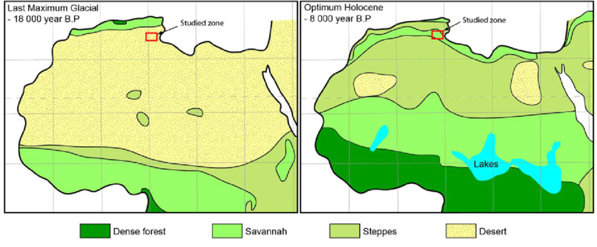 This suggests that there was genetic exchange between North Africa and the southern Mediterranean(fig.1) region as far back as the Epipaleolithic period (around 22,000 to 11,000 years ago), showing early connections between these areas, approximately 11 KA, much of the Sahara was extremely dry and largely uninhabitable prior to the African humid period. The region experienced hyper-arid conditions, similar to what we see today, with limited vegetation and water sources, This made it difficult for humans and large animals to survive in the region.(fig.2)