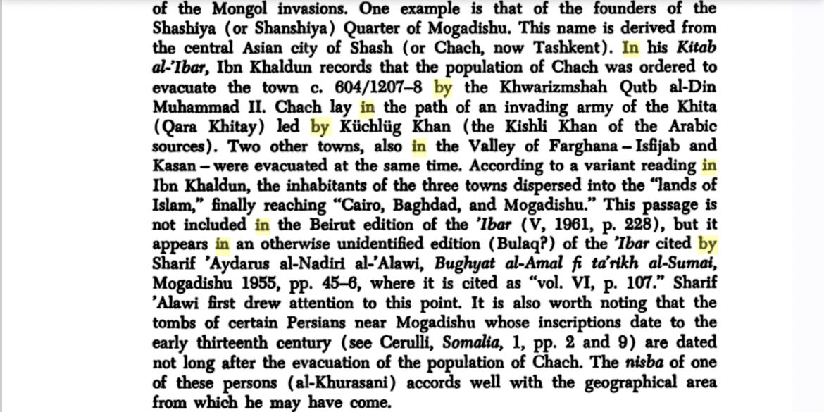 “In his Kitab al-Ibar, Ibn Khaldun records that the population of Chach was ordered to evacuate the town c. 1207-8 by the Kwarizmshah Qutb al-Din Muhammad the II. Chach lay in the path of an army of the Khita (Qara Khitay) led by Kuchlug Khan. Two other towns, also in the valley of Farghana - Isfijab and Kazan - were evacuated at the same time. According to a variant reading in Ibn Khaldun, the inhabitants of the three towns dispersed into the lands of Islam ‘finally reaching Cairo, Baghdad and Mogadishu.’ “ — Muslim Brotherhoods in Nineteenth-Century Africa by B. G Martin p. 232