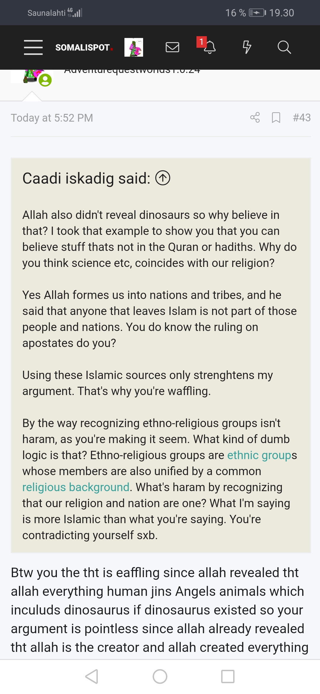 Allah also didn't reveal dinosaurs so why believe in that? I took that example to show you that you can believe stuff thats not in the Quran or hadiths. Why do you think science etc, coincides with our religion?You the tht is waffling and if dinosaurus existed allah created it but allah didnt revealed ethno-religious in quran or hadiths