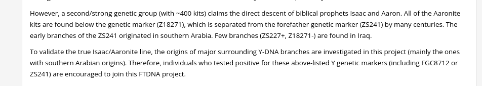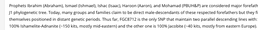 There other supposed proof is that the J sub clade have tw branches which is 100% ismail and 100% Ishaaq, it has 4 different lineages within that I checked the FTDNA it's like 4 different lineages within it now. Also T have a jewish and arab branch as well so it's not enough proof for the J-FGC8712 one. T-Y168797 has major 2 branches at the moment but a part of the T-Y16897 is 100% Jewish.