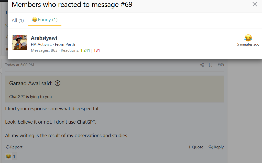 The clown was trying to tell me my takes are horrendous meanwhile half the people on here hate him because he is obsessively anti-Somali"Behold this individual—no matter what I write, his response is always a smile
