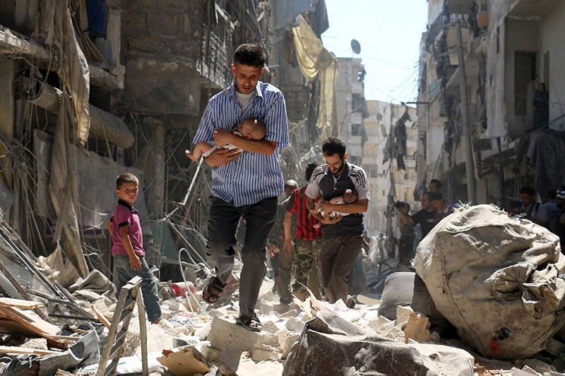 Syrian men carrying babies make their way through the rubble of destroyed buildings following a reported air strike on the oppositionl-held Salihin neighbourhood of the northern city of Aleppo