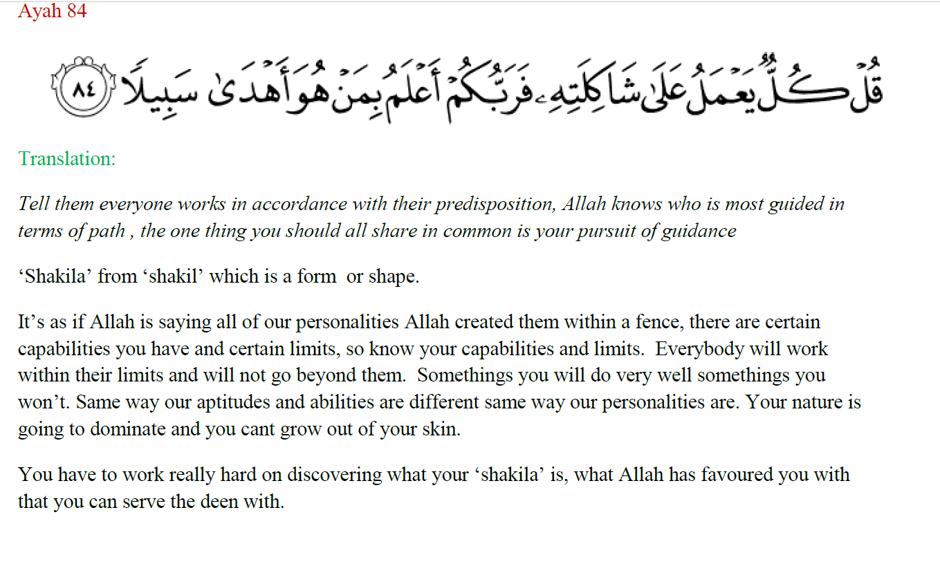 to mankind): "Each one does according to Shakilatihi (i.e. his way or his religion or his intentions, etc.), and your Lord knows best of him whose path (religion, etc.) is right."