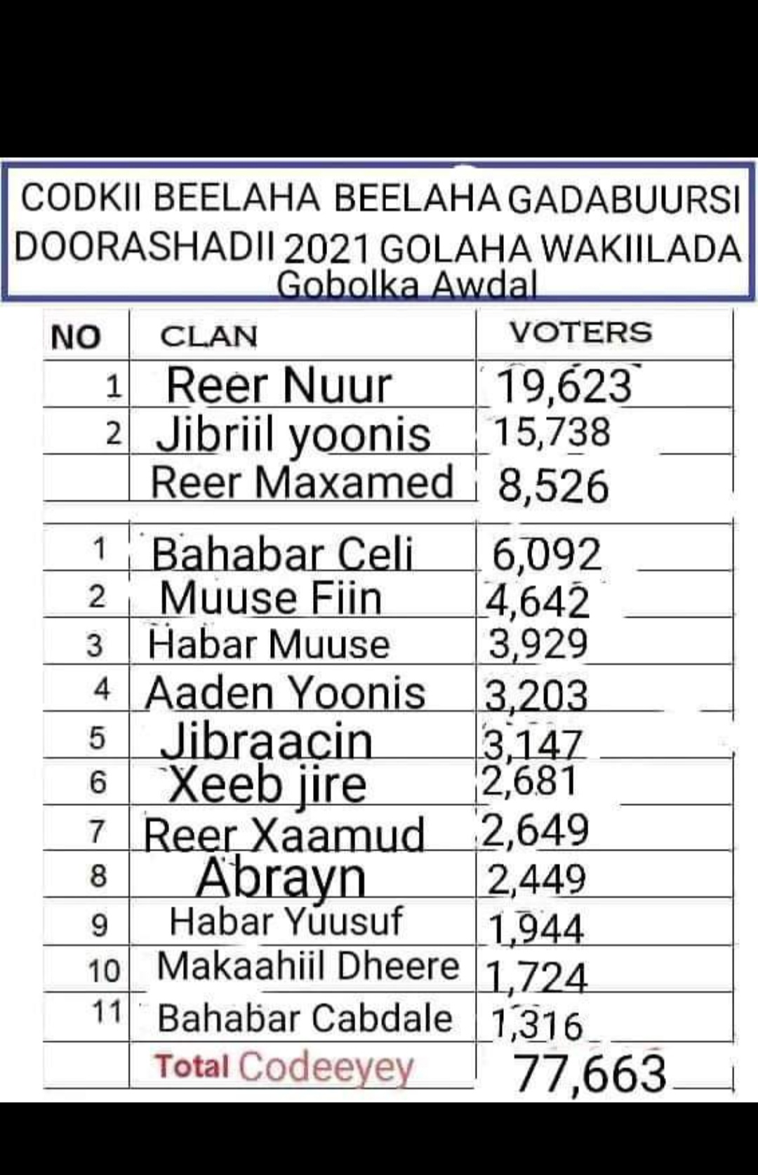 85% of total Awdal vote were Sameroon. Most Ciise left to Djibouti for better livelihood. I believe they got 12k vote against Sameroon 77k. Isaaq are nearly nonexistent less than 800 vote in Awdal, it's overwhelmingly Sameroon decisive majority region 77k out of 90k, 85% Sameroon majority region.