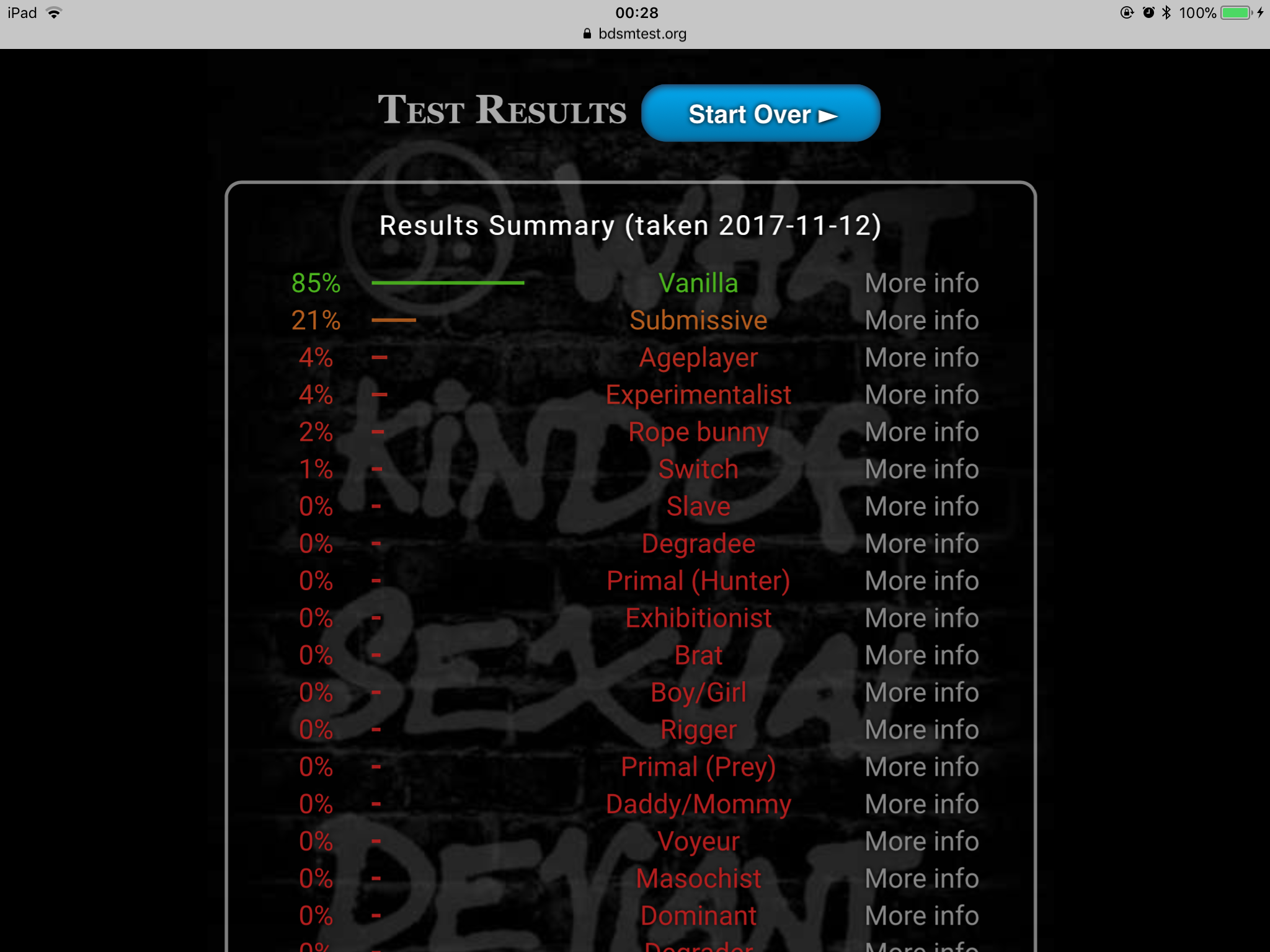 [ https://bdsmtest.org/ ] here if you’d like to do it my results aren’t surprising at allI’ve always been a dominant person. Can’t believe I got 43% Vanilla