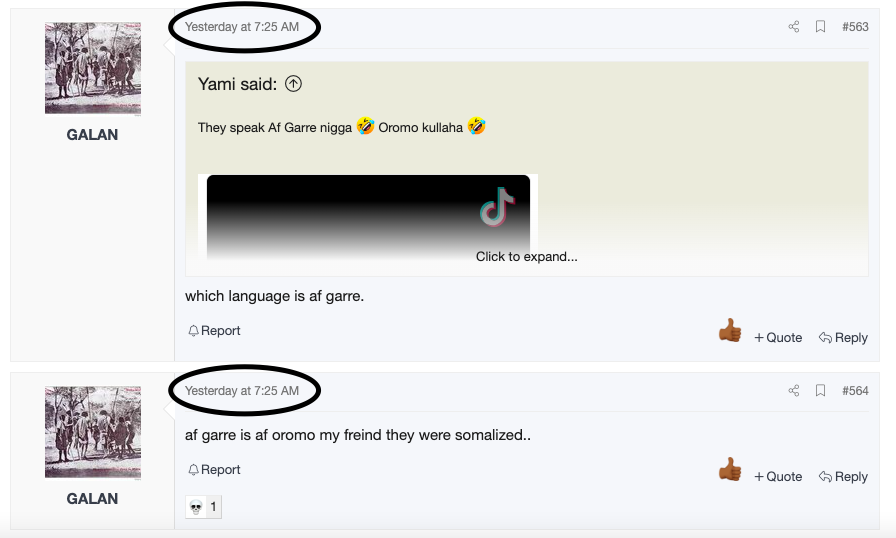Look at the timeline between the two posts below. First he said 'which language is af-Garre', then within the *same minute*, he's convinced that af-Garre is Oromo and that they're Oromized. You can't make this sh*t up kkk