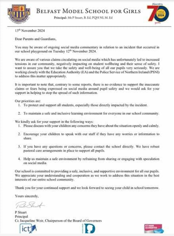 Story emerging out of Belfast, Uk, gaining traction in media and right wing media. Parents are going to protest outside the school today.