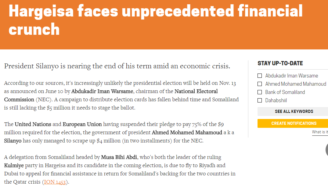 in Hargeisa and its candidate in the coming election, is due to fly to Riyadh and Dubai to appeal for financial assistance in return for Somaliland's backing for the two countries in the Qatar crisis (ION 1453).