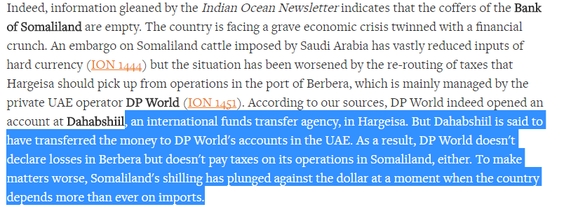 are empty. The country is facing a grave economic crisis twinned with a financial crunch. An embargo on Somaliland cattle imposed by Saudi Arabia has vastly reduced inputs of hard currency (ION 1444) but the situation has been worsened by the re-routing of taxes that Hargeisa should pick up from operations in the port of Berbera, which is mainly managed by the private UAE operator DP World (ION 1451). According to our sources, DP World indeed opened an account at Dahabshiil, , an international funds transfer agency, in Hargeisa. But Dahabshiil is said to have transferred the money to DP World's accounts in the UAE. As a result, DP World doesn't declare losses in Berbera but doesn't pay taxes on its operations in Somaliland, either. To make matters worse, Somaliland's shilling has plunged against the dollar at a moment when the country depends more than ever on imports.