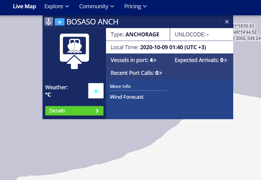 For the period 29/09 - 09/10, Bosaso port was only active for the three days of 30/09, 03/10 and 07/10. The activity is quite sporadic and limited. The majority of entries belong to RAS SYAN which is a tugboat and not a ship.
