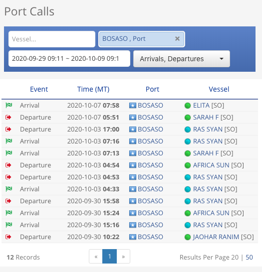 For the period 29/09 - 09/10, Bosaso port was only active for the three days of 30/09, 03/10 and 07/10. The activity is quite sporadic and limited. The majority of entries belong to RAS SYAN which is a tugboat and not a ship.