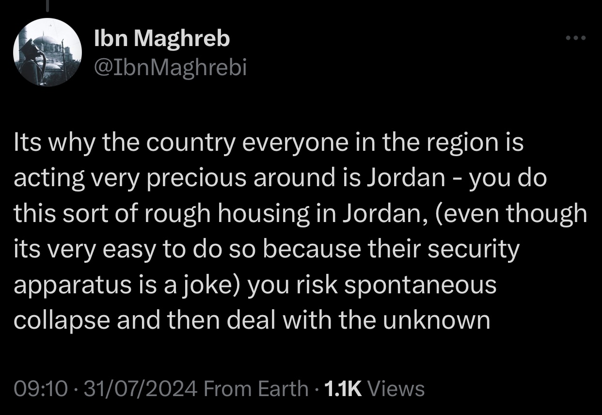 But really, the resistance just needs to continue what they doing it’s not in their strategic interest to escalate anything. Israel is already collapsing.