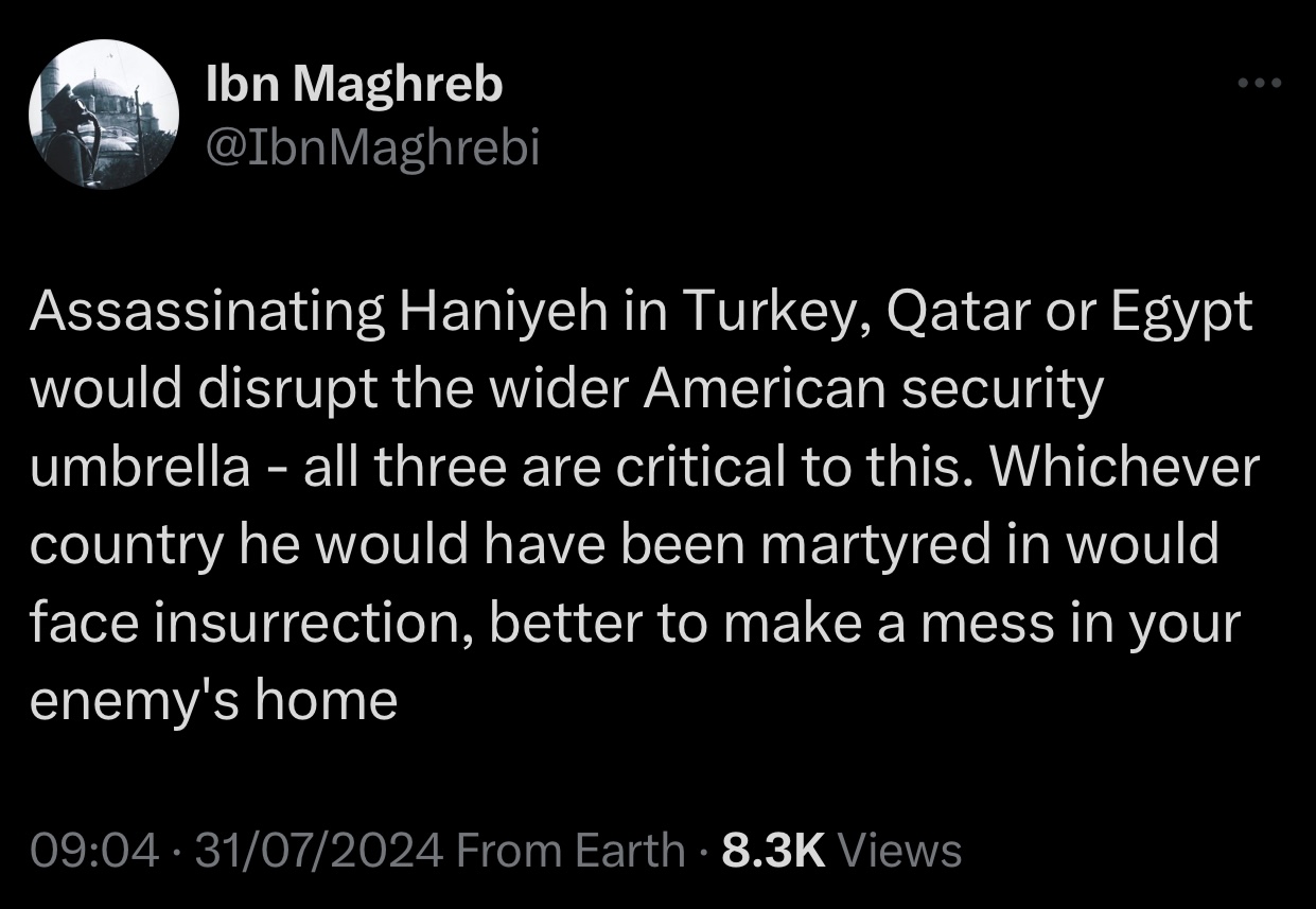 This analysis makes so much sense. I thought the same earlier today, that Israel wouldn’t risk attacking him with a drone/missile inside Qatar and Turkey but would in Iran since there already enemies. I have to begrudgingly give it to the Zionists, they’re moves come mainly from ego but they seem to have thought this one through. Their targeting, intelligence, and satellite surveillance definitely came from the Americans tho.