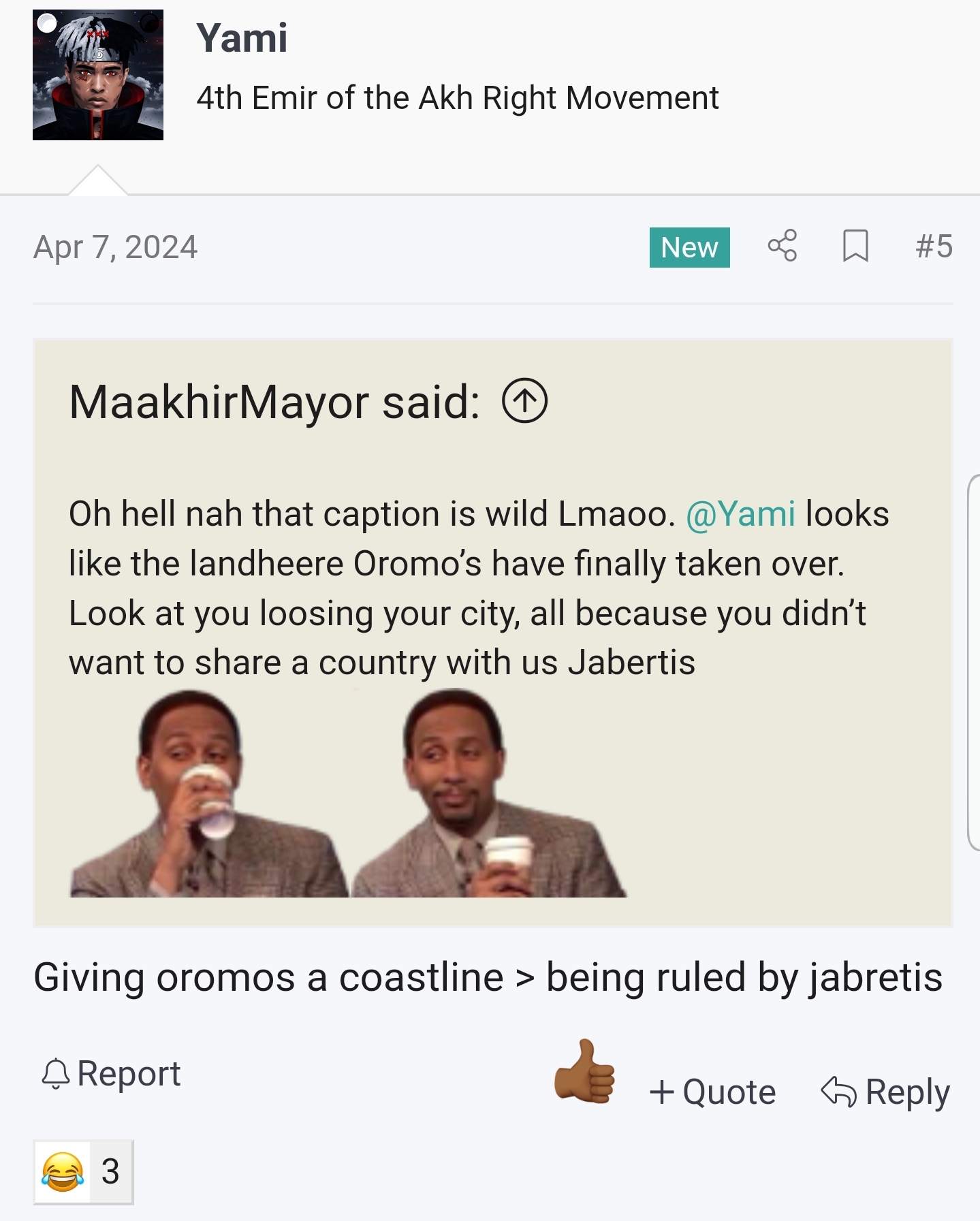 we have nothing to do with those people why do they care so much Somalis dont even border Bantus people only the ones in NFD do.He should mind his business and not make anti Somali memes it’s not funny considering the fact that it all centres around Somalis back home who have suffered and are still suffering from the effects and traumas civil war and terrorism.They do not care about usThe oromo girl in question liked the tweet. But beyond that, it's now it's a bunch of cadaans, latins, and indians liking it because it reached their side of twitter.
