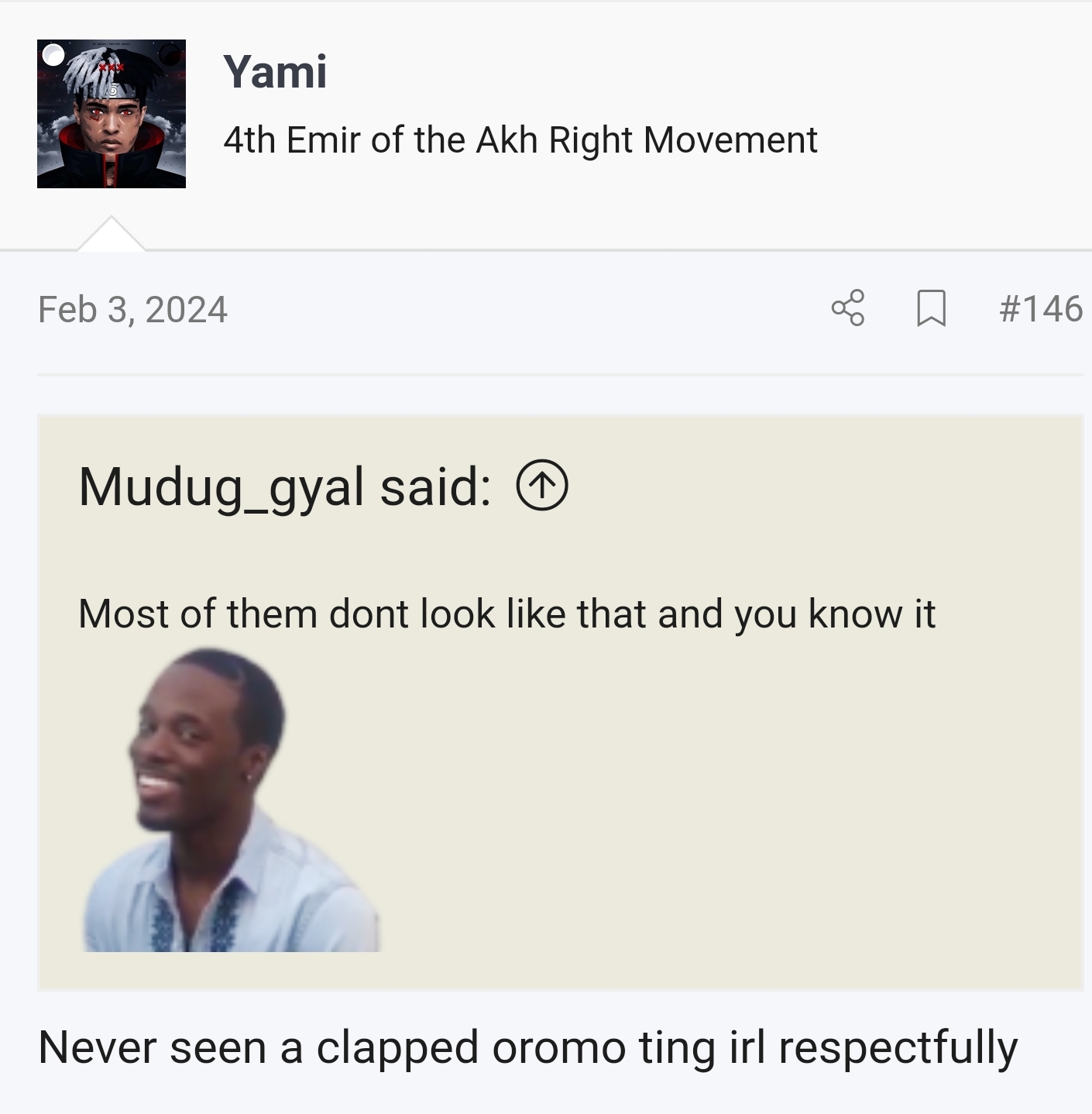 Fair point. I don’t support the domination of any specific tribe good try at fooling the somali public you the son of an oromo woman aqas. Warya im somali i am ur master my boyI can take my shahada any day but I'm never supporting jebreti and hawiye domination sorry.