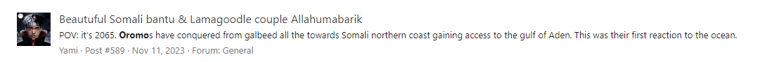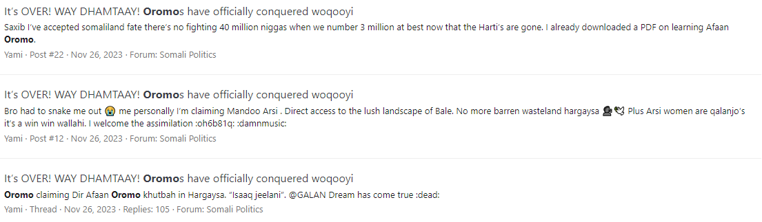 Come enslave me then. Personally I don't mind Somali women are very attractive demographicFair point. I don’t support the domination of any specific tribe good try at fooling the somali public you the son of an oromo woman aqas. Warya im somali i am ur master my boy