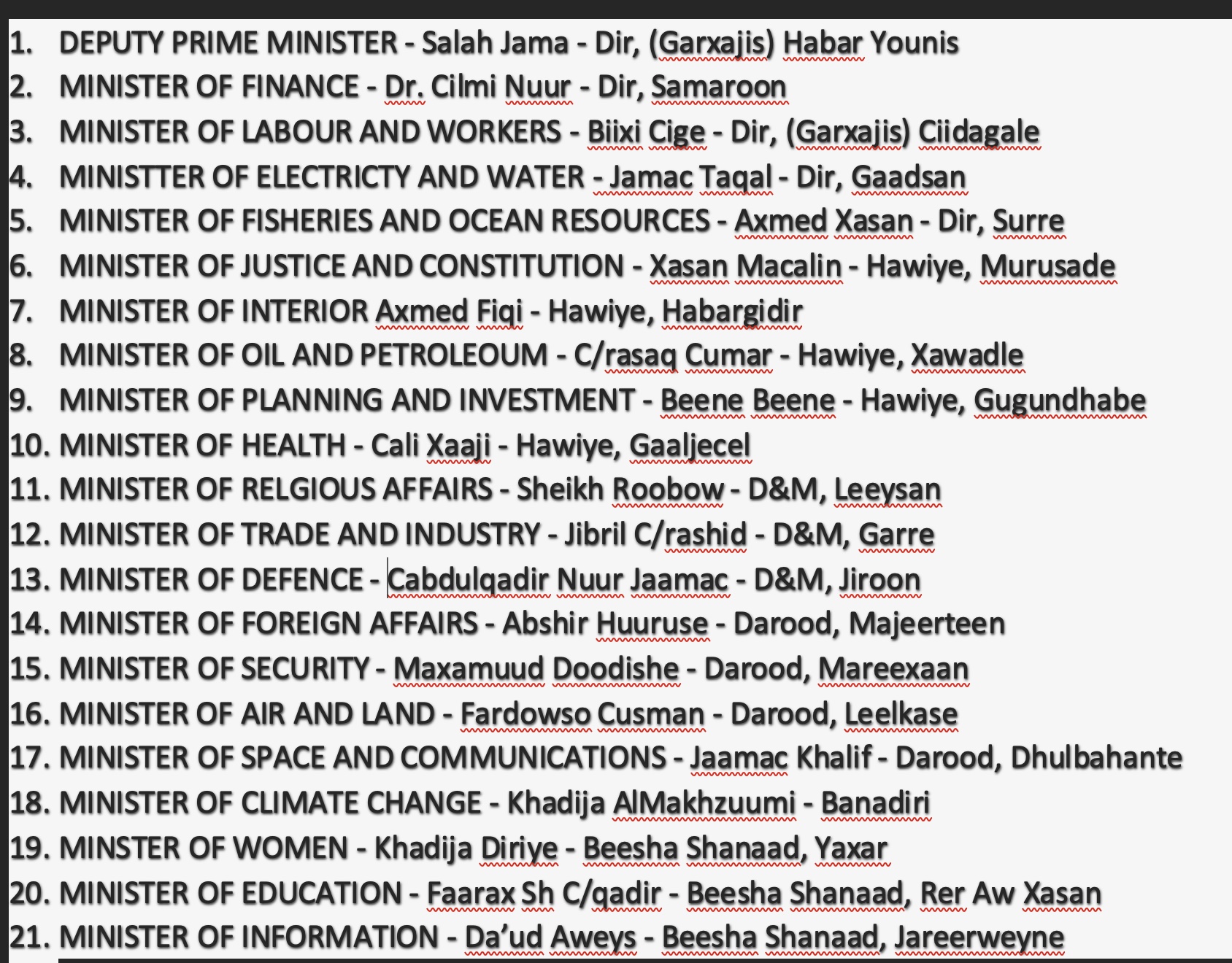 1. Money - the most likely in vast majority of cases, even for someone like Biixi Imaan. Isaaqs can very quickly get a lot of under the table money and a good salary because the FGS is often desperate to have someone represent the Isaaq community and will pay them a lot of money up front. It is attractive even to someone like Biixi because he can command a higher figure than the average taxi driver they pluck of the streets of Xamar.