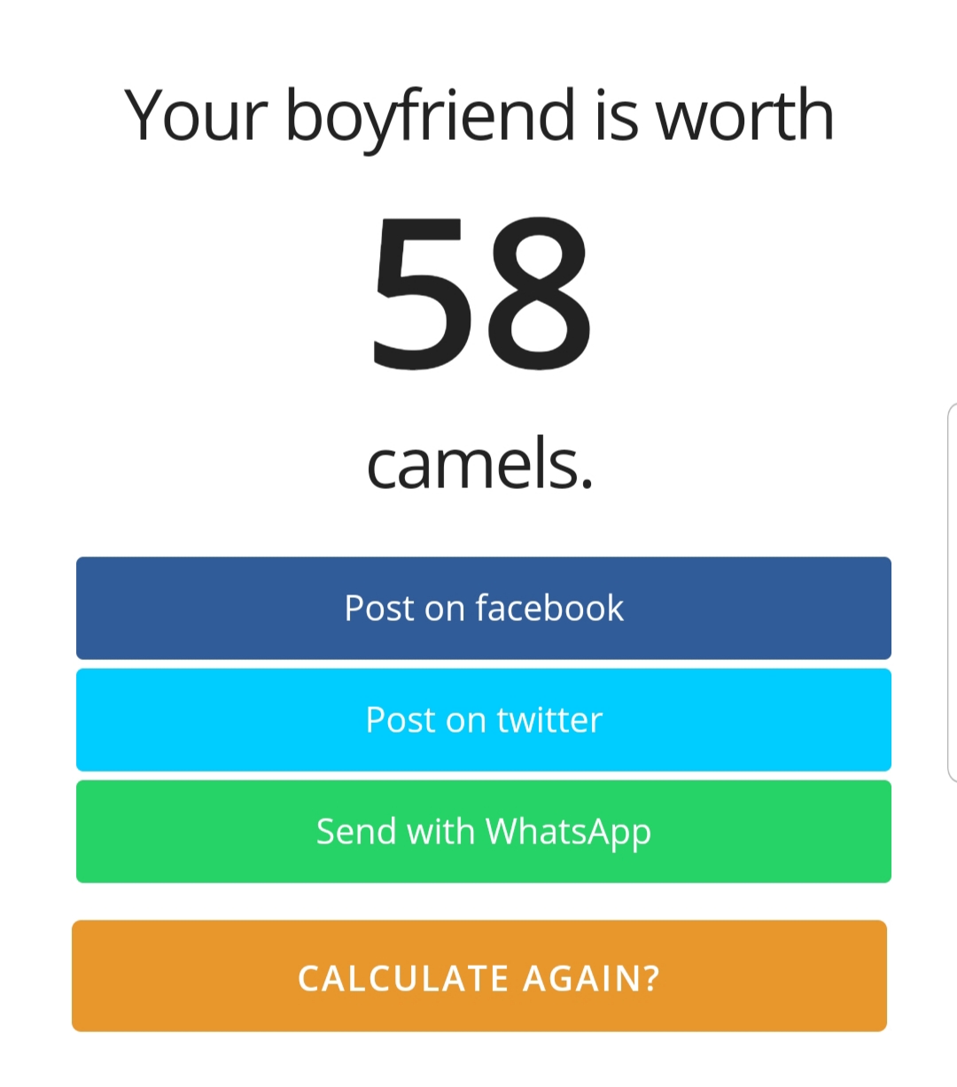 Guys here's an app where you can calculate how many camels it'll cost you. If you're planning to get married..