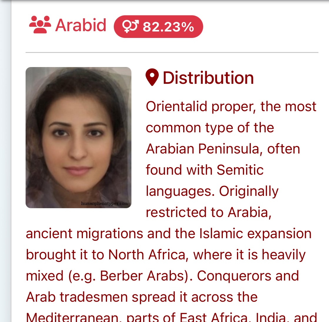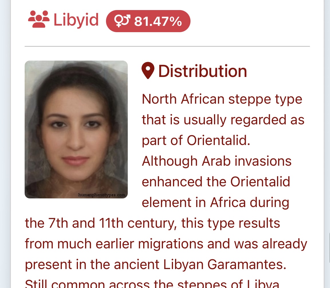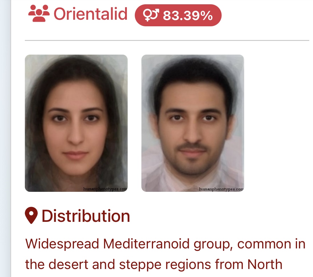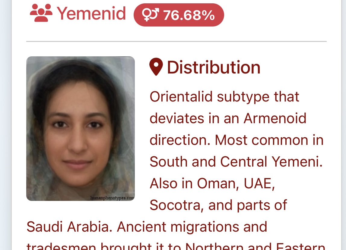 These are the top four guesses, I also got Indian obviously. Very crazy that I got over 80% for ME phenotypes. I think the AI got confused with the hijab and lighter brown skintone. Yemeni doesn’t surprise me, I’ve been getting confused for that for years, but I do NOT have the typical Gulf nose.
