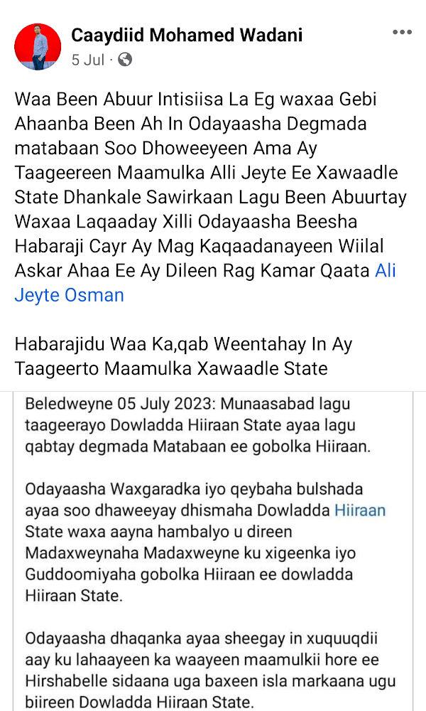 Reer Matabaan said your Hiiraan State is a joke and to not be taken seriously. It's you who has grievances against the real state Hirshabelle which i have representation in alongside Koonfur Galbeed and Benadir while my Karanle brothers are in Ethiopian and Kenyan politics. Murusade built Galmudug in 2006 alongside Sacad and Sheekhaal when it was a Mudug state and it's expanded to Galgaduud to include Dir, Daarood and other Hawiye. Galmudug's MX VP was arranged by HSM to compensate for a Sheekhaal VP in Jubaland. We have Speaker in Galmudug.