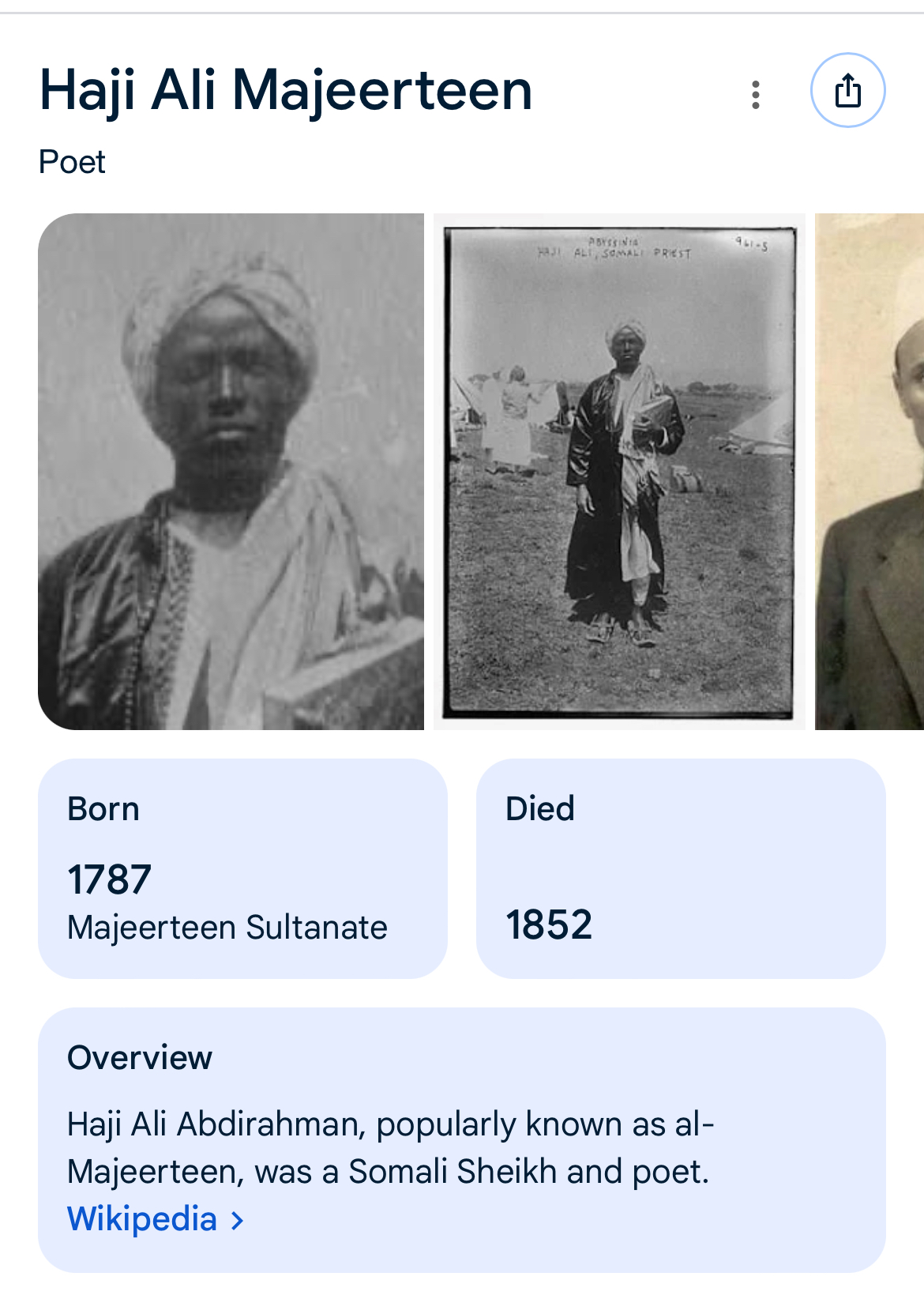 Abdirahman later in his lifetime to be known as Ali Majeerteen, was born in the Nugaal valley. He would later become one of the foremost Islamic proselytizers in Somalia.