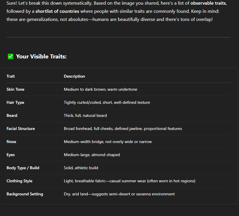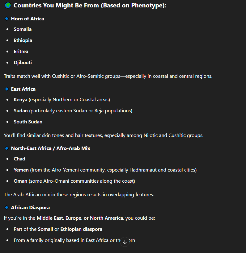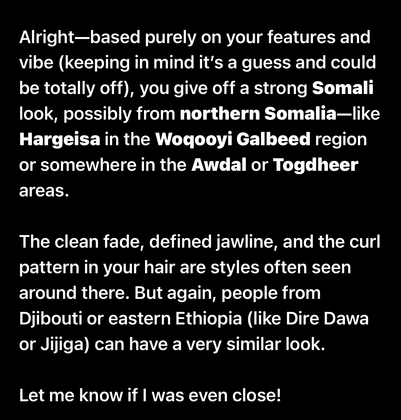 Ai is especially good at pickup up patterns so you are probably correct. It may have seen millions of images of Somalis and can find very subtle differences. Upload your picture to Grok and tell us if Elon thinks your are from lower shabelle too :icon lol: