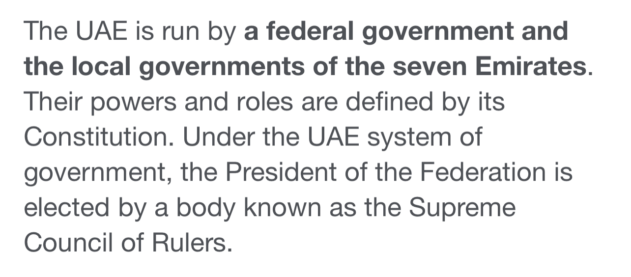 UAEs βcentralβ government is a council of the leaders of every Emirate(state). This is a prime example of a federation and they were able to hedge their superior system and now colonize the horn of Africa.