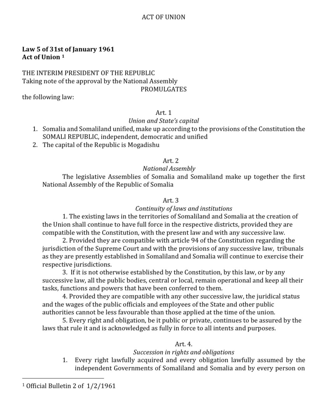 There's no act of union that is signed by both Somaliland and Italian Somaliland that is the same. It dont' exist. They both created different documents, neither group signed a final document and ratified in parliament, so it doesn't meet international law standards. It was more like a gentlemens agreement which was later rejected by Somaliland.