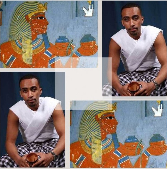 Here's a picture of him killing his rivals, all of whom have afros, the majority of Egyptians had afros or dread locks, none of which are achievable by foreigners, dread locks, yes, but not afros
