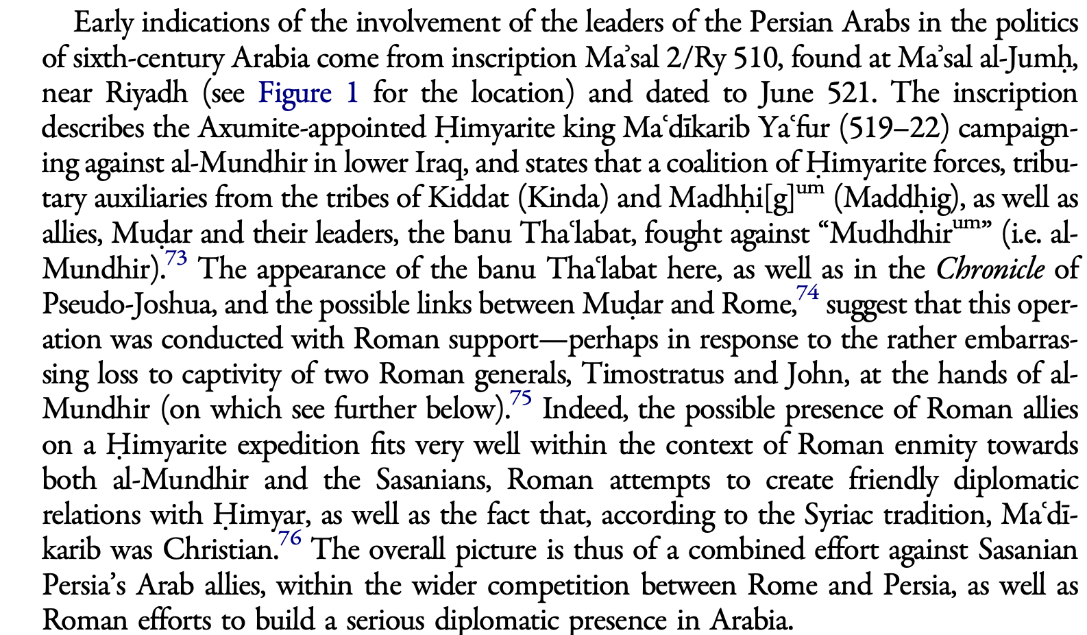 Maʿdīkarib Yaʿfur king of Sabaʾ, of dhu-Raydān, of Hadramaut, and of Yemen, and of the Arabs in the Upper-Country and on the Coast, announced and recording this inscription in Maʾsalum Gumh ˙ ān, while returning from an expedition in the ʿIrāq of Kūtaʾ, in order that he submitted the rebellious Arabs to him when Mundhir made war with him. He undertook this expedition with the tribes of Sabaʾ, Himyarum, Rahbtān, Hadramaut, and Yamna, with his Arabs Kiddat and Madhigum and with his allies the banū Thaʿlabat et Mu(d ˙ a)r. He was campaigning in the month of Qyẓn, six hundred thirty-one.