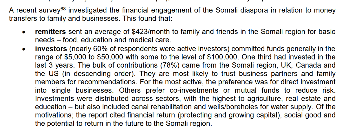I’ll save the rest of my research for elsewhere. But this alone shows you: the Somali diaspora and local private sector have ''immense potential''. If that energy were properly coordinated and organized, we could easily raise and allocate many billions for national development