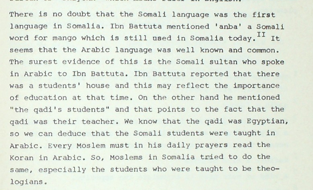 He also provides linguistic evidence that Mogadishu population spoke Somali, when , mentions their words for certain fruits in the Maqdisihi language.