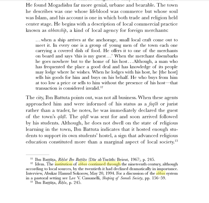 As well as describes Mogadishu organized under the Somali ''abaan'' institution which is a local commericial practice that is used from north to south.