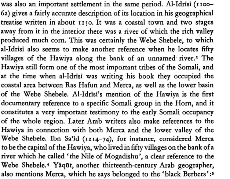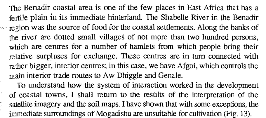 The earliest mentions of Mogadishu/Merca in medieval sources paints the same picture, connecting it to it's hinterland and describing the 50 farming villages along the banks of the river.