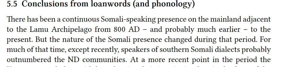 The swahili theories are outdated bunk pseudo history. There was already Somalis living on the Southern coast all the way down to the Lamu Archipelago by the time they met Swahili speakers in Northern Kenya that was moving north and Swahili speakers didn't reach mainland Somalia.
