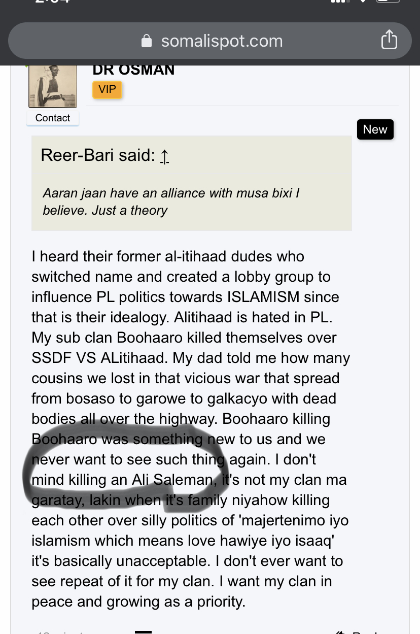 I heard their former al-itihaad dudes who switched name and created a lobby group to influence PL politics towards ISLAMISM since that is their idealogy. Alitihaad is hated in PL. My sub clan Boohaaro killed themselves over SSDF VS ALitihaad. My dad told me how many cousins we lost in that vicious war that spread from bosaso to garowe to galkacyo with dead bodies all over the highway. Boohaaro killing Boohaaro was something new to us and we never want to see such thing again. I don't mind killing an Ali Saleman, it's not my clan ma garatay, lakin when it's family niyahow killing each other over silly politics of 'majertenimo iyo islamism which means love hawiye iyo isaaq' it's basically unacceptable. I don't ever want to see repeat of it for my clan. I want my clan in peace and growing as a priority.
