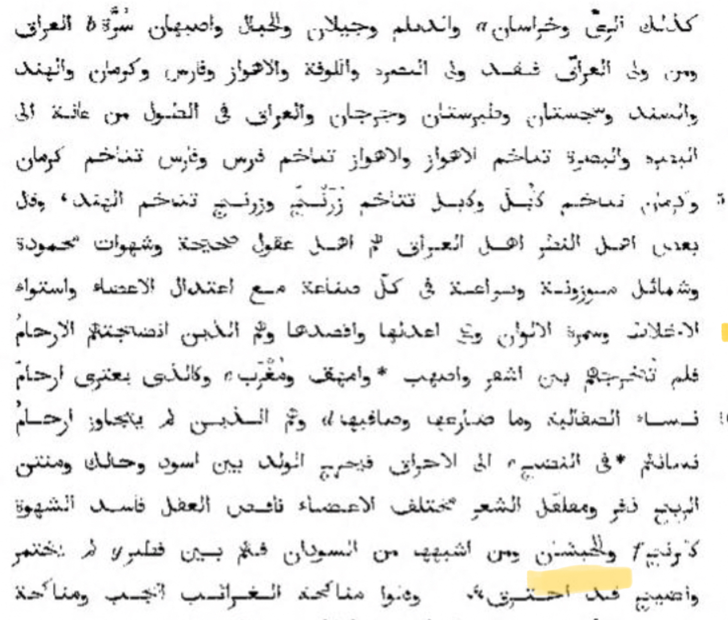"A man of discernment said: The people of Iraq ... do not come out with something between blonde, buff and blanched coloring, such as the infants dropped from the wombs of the women of the Slavs and others of similar light complexion; nor are they overdone in the womb until they are burned, so that the child comes out something between black, murky, malodorous, stinking, and crinkly-haired, with uneven limbs, deficient minds, and depraved passions, such as the Zanj, the Somali, and other blacks who resemble them. The Iraqis are neither half-baked dough nor burned crust but between the two."