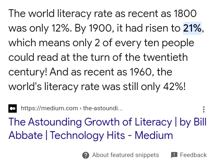 What was the point of this thread? Did somalis write and read in ancient times?IWhy are you bringing up the 1900s? I am speaking about the 1970s. It is true that most of the world was illiterate during that period. Your argument doesn't substantiate anything. If I am speaking about the 1900s, then you would have a valid point. The majority of the world was not illiterate prior to the 1970s. The global literacy rate was not in the single digit numbers prior to the 1970s. Again, if it was, you would have a valid point. Even in the 1820s, the global literacy rate was higher than Somalia in 1972. Do you realize how embarrassing that is? Ethiopia also had an embarrassing literacy rate. What is the point of bringing that up?