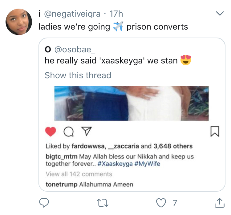 Instead of making threads about what inmate some random Xalimo is marrying, worry about Somali men who are actually becoming inmates.